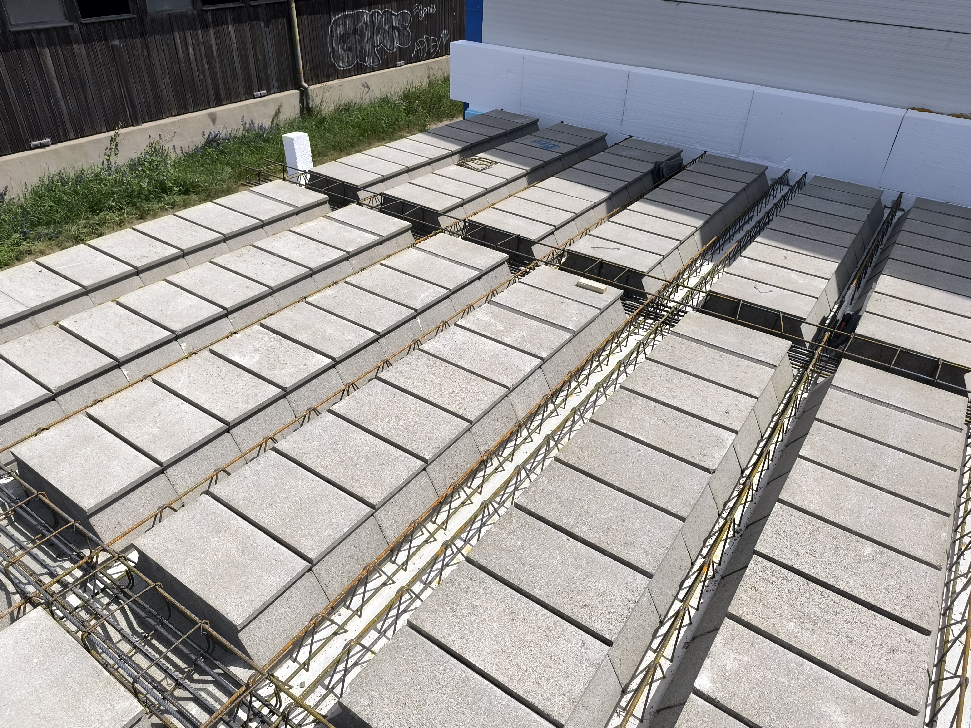 Jakmile jsou nosníky správně uloženy a podepřeny, začíná se s pokládkou betonových vložek. Ty se vkládají mezi nosníky nasucho těsně na sraz, a to: