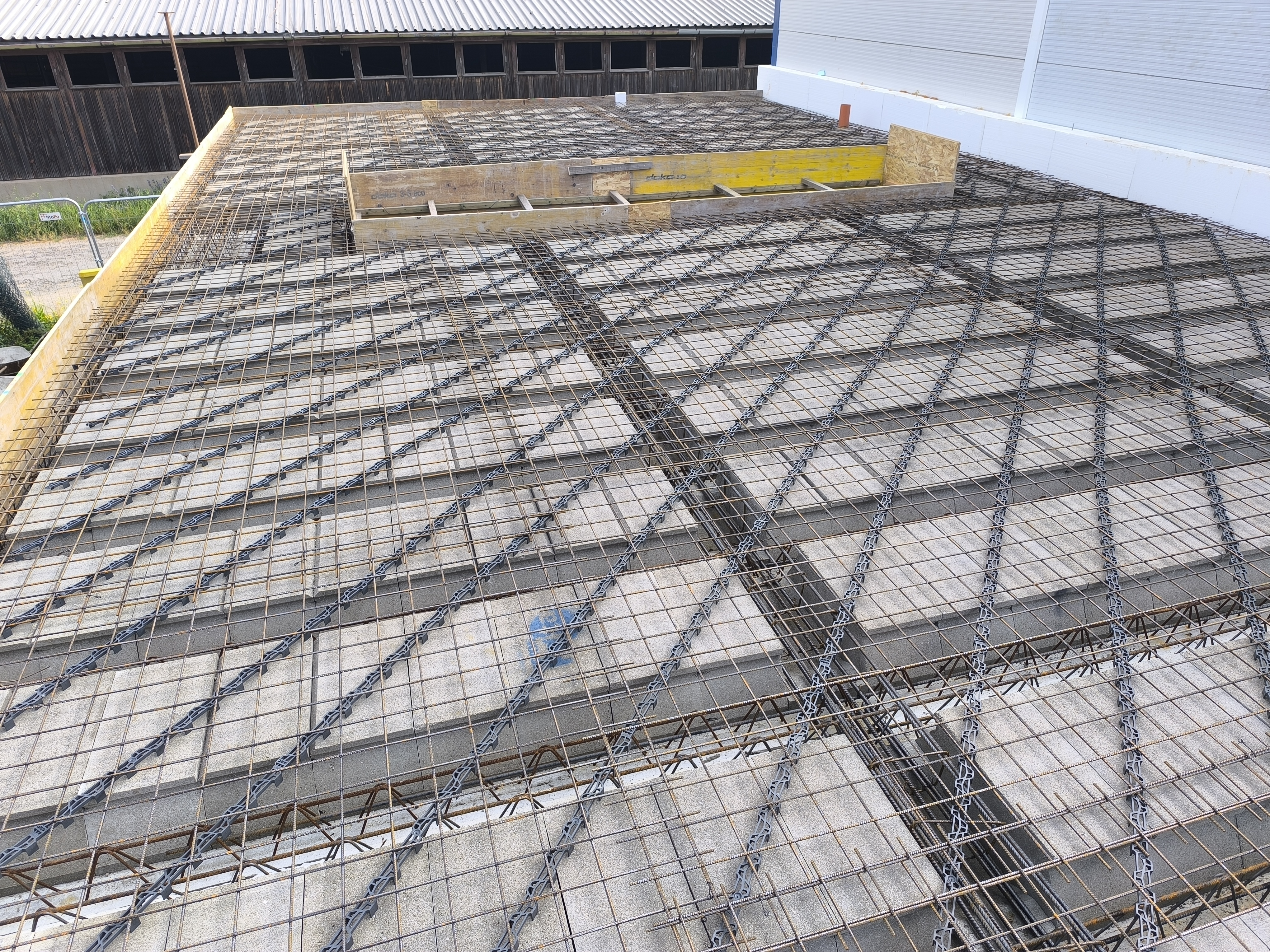 Následuje uložení výztuže ztužujících věnců, kari sítě nadbetonávky a případně i doplňková výztuž specifických detailů stropní konstrukce.