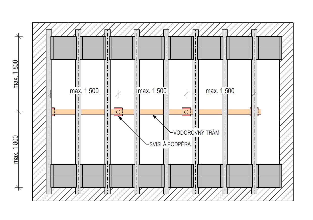 - roznášecí trámy/systémové nosníky se podepírají stavebními stojkami ve vzdálenosti max. 1500 mm
