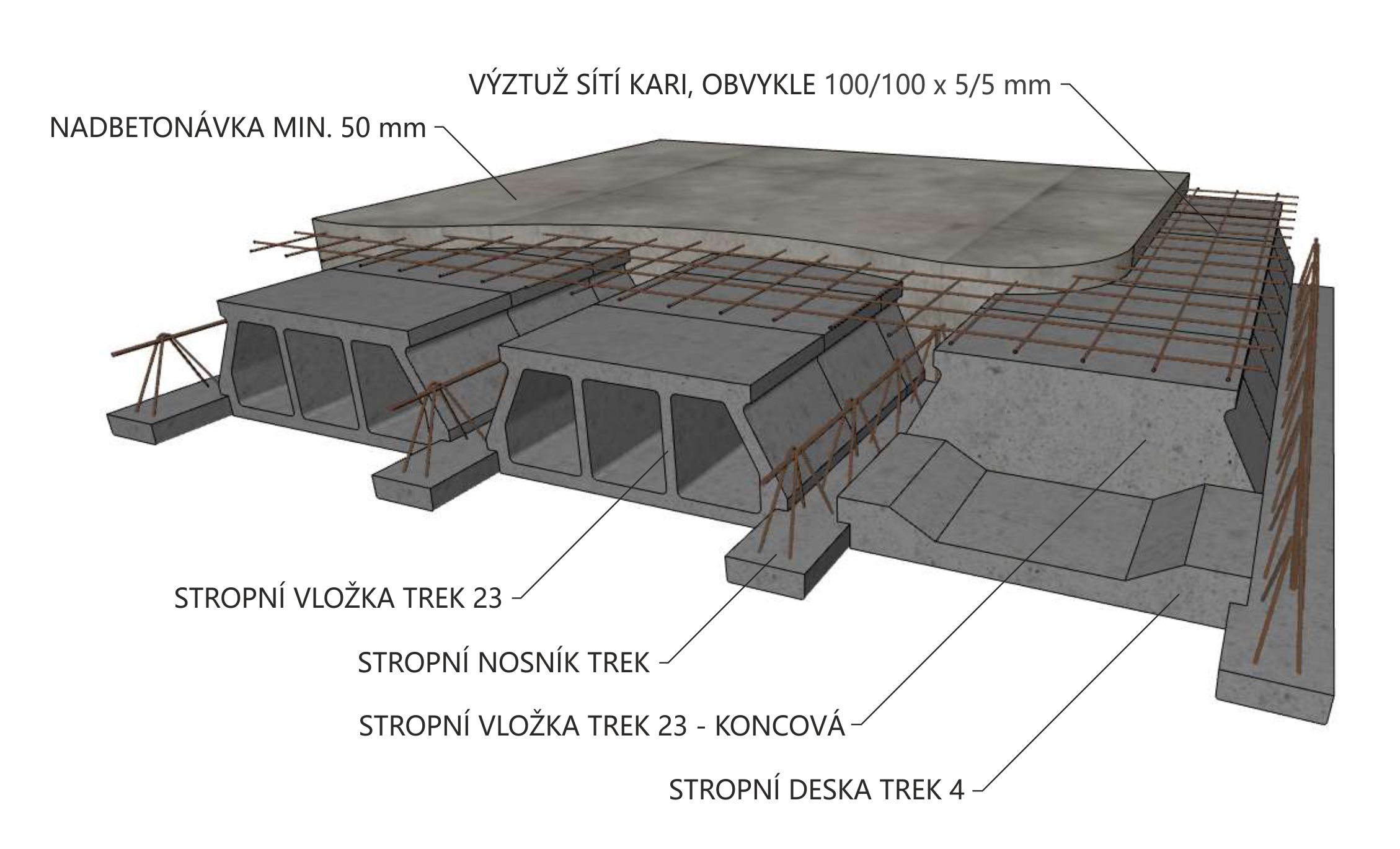 Stropní systém TREK po vytvrdnutí betonu tvoří monolitickou železobetonovou stropní konstrukci, která zajišťuje vysokou únosnost a tuhost celé stavby.