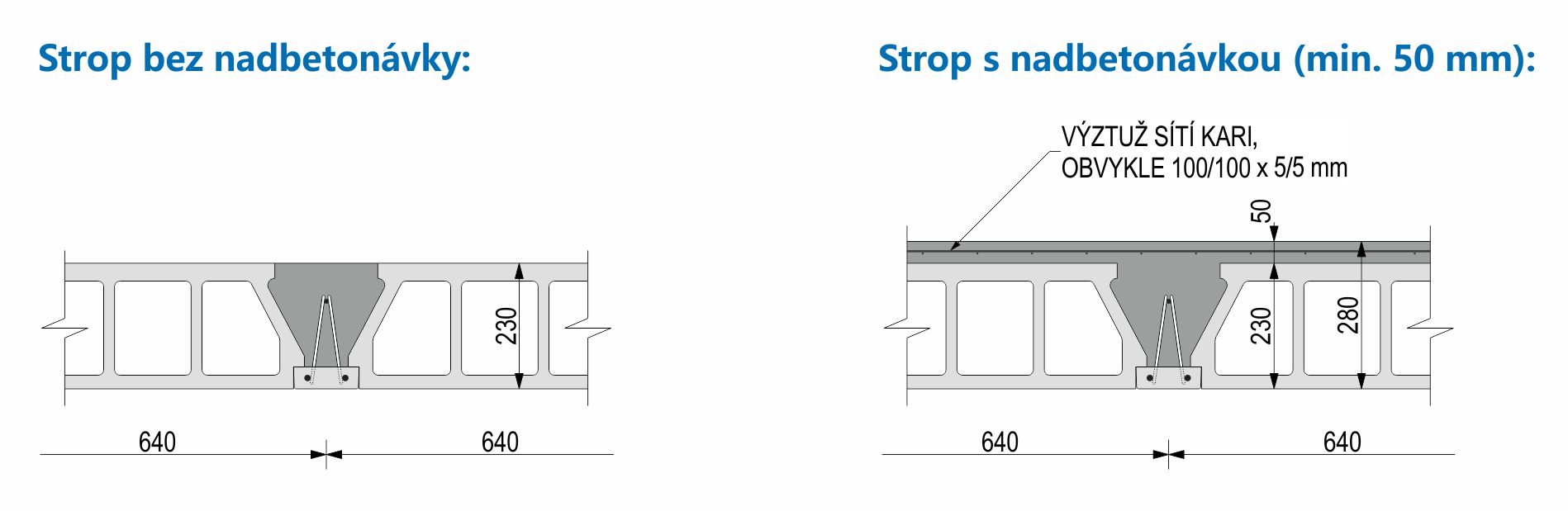 - výška nadbetonávky je min. 50 mm, nadbetonávka tl. nad 70 mm už není efektivní, naopak stropní konstrukci spíše přitěžuje, než by napomáhala únosnosti celé konstrukce